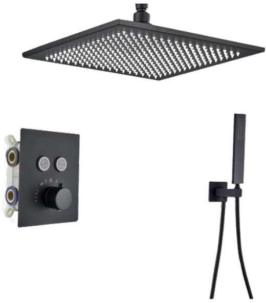 Zuhanyszett|Szín: matt fekete|2 utas, termosztatikus csaptelep|Magasság: min. 77 - max. 123 cm|Szélesség: 20 cm|Fejzuhany: 20x20 cm|Szükséges víznyomás: max. 5 bar
