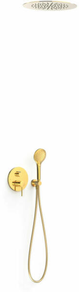 Falba építhető kivitel Tartalmazza a belső egységet Egykaros zuhanycsaptelep 380 mm-es mennyezeti fejzuhannyal 110 mm-es 3 funkciós, vízkőmentesített kézi zuhannyal és fali tartóval Szatén zuhanytömlővel Arany színben