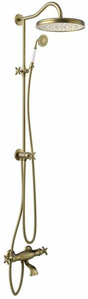 Falon kívüli kádcsaptelep 310 mm-es gömbcsuklós fejzuhannyal 78 mm-es vízkőmentesített kézi zuhannyal Duplán reteszelt zuhanytömlővel Zuhanyváltó beépített átfolyáskorlátozóval Kopott réz színben
