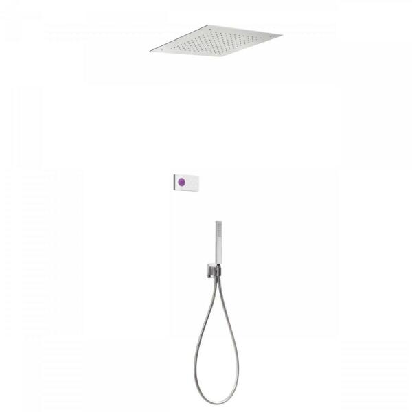Fehér elektronikus vezérlőpanel Falba építhető elektronikus belső egységet tartalmazza 500 x 500 mm-es rozsdamentes acél mennyezeti fejzuhannyal Vízkőmentesített kézi zuhannyal és fali tartóval Szatén zuhanytömlővel Króm kivitel