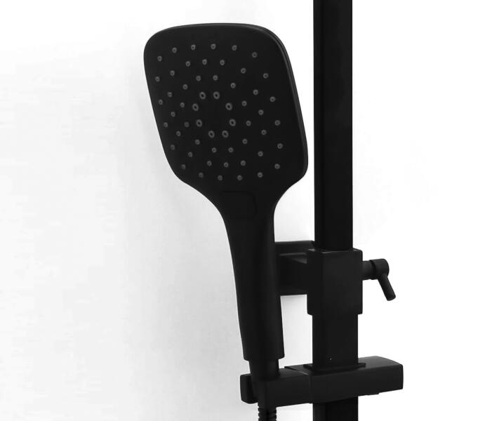 Deante falon kívüli termosztátos zuhanyrendszer behajtható kádkifolyóval, matt fekete NAC_N1HT Garancia: 5 év Telepítés: falon kívüli szerelés Csaptelep típusa: termosztatikus Acél rúd Állítható magasság: 1070-1445 mm Zuhanyváltó típusa: mechanikus kerámia Ultra vékony acél zuhanyfej gömbcsuklóval Zuhanyfejátmé rője: 250 mm Zuhanykar hossza: 370 mm Behajtható kádkif