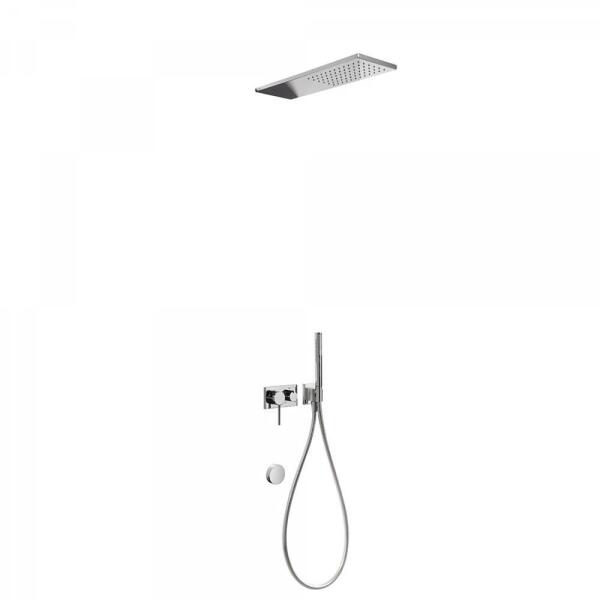 Falba építhető kivitel Tartalmazza a 3 utas belső egységet is 160 x 550 mm-es rozsdamentes acél fejzuhannyal Cascade kádbeömlővel Vízkőmentesít ett kézi zuhannyal és fali tartóval Szatén zuhanytömlővel Króm kivitel