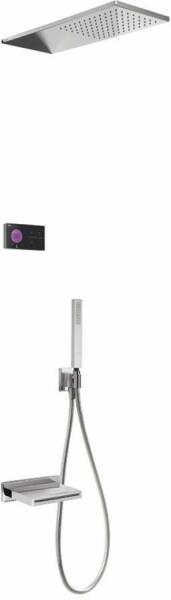 Fekete elektronikus vezérlőpanel Falba építhető elektronikus 3 utas belső egységet tartalmazza 210 x 550 mm-es rozsdamentes acél fejzuhannyal Acél cascade kádkifolyóval Vízkőmentesít ett kézi zuhannyal és fali tartóval Szatén zuhanytömlővel Króm kivitel