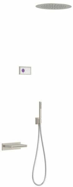 Fehér elektronikus vezérlőpanel Falba építhető elektronikus 3 utas belső egységet tartalmazza 380 mm átmérőjű rozsdamentes acél mennyezeti fejzuhannyal Acél cascade kádkifolyóval Vízkőmentesít ett kézi zuhannyal és fali tartóval Szatén zuhanytömlővel Acél színben