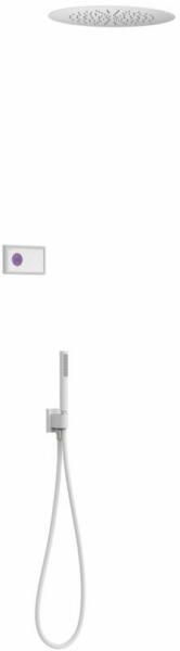 Fehér elektronikus vezérlő Falba építhető elektronikus belső egység 380 mm átmérőjű rozsdamentes acél mennyezeti fejzuhannyal Vízkőmentesített kézi zuhannyal és fali tartóval Szatén zuhanytömlővel Matt fehér színben