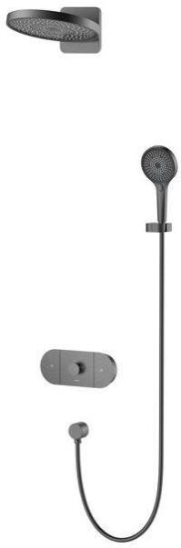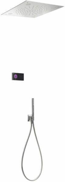 Fekete elektronikus vezérlő Falba építhető elektronikus belső egység 500 x 500 mm-es mennyezeti fejzuhannyal Vízkőmentesített kézi zuhannyal és fali tartóval Szatén zuhanytömlővel Króm kivitel