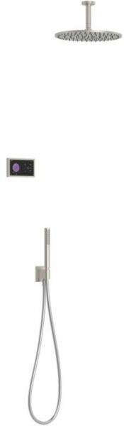 Fekete elektronikus vezérlő Falba építhető elektronikus belső egység 300 mm-es gömbcsuklós mennyezeti fejzuhannyal Vízkőmentesített kézi zuhannyal és fali tartóval Szatén zuhanytömlővel Acél színben