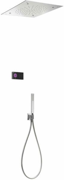 Fekete elektronikus vezérlő Falba építhető elektronikus 3 utas belső egység 500 x 500 mm-es rozsdamentes acél mennyezeti fejzuhany 2 fúvókával Vízkőmentesített kézi zuhannyal és fali tartóval Szatén zuhanytömlővel Króm kivitel