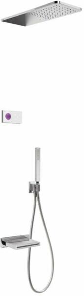 Fehér elektronikus vezérlőpanel Falba építhető elektronikus 3 utas belső egységet tartalmazza 210 x 550 mm-es rozsdamentes acél fejzuhannyal Acél cascade kádkifolyóval Vízkőmentesít ett kézi zuhannyal és fali tartóval Szatén zuhanytömlővel Króm kivitel
