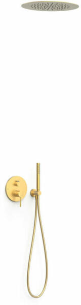 Falba építhető kivitel Tartalmazza a belső egységet Egykaros zuhanycsaptelep 380 mm-es mennyezeti fejzuhannyal Vízkőmentesített kézi zuhannyal és fali tartóval Szatén zuhanytömlővel Matt arany színben