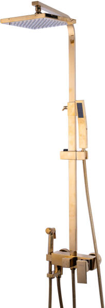Zuhanyoszlop, TRENDY S, négy funkciós plusz bidé funkció, arany. - mobil zuhany (egy funkció) - fő zuhanyoszlop felső zuhanyfejjel - bidé funkció az csaptelep oldalára szerelve a bal oldalon. A zuhanyoszlop funkciói közötti váltás az csaptelep előlapjára szerelt terelő segítségével történik (az oszlop funkciói a terelőre vannak írva). A zuhanyoszlop patronja kerámia (has