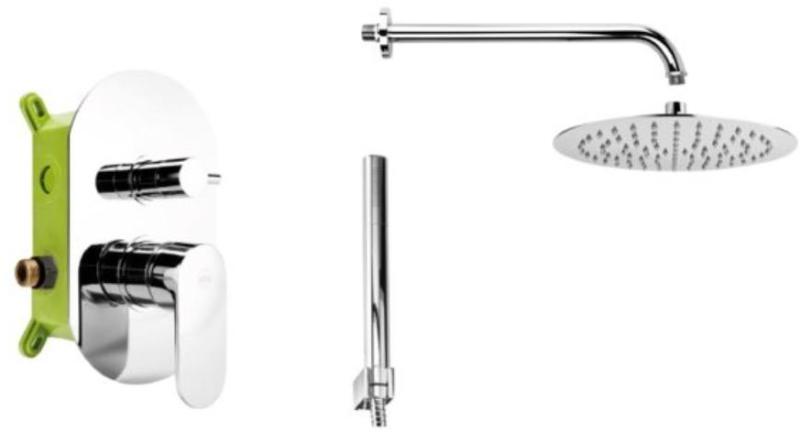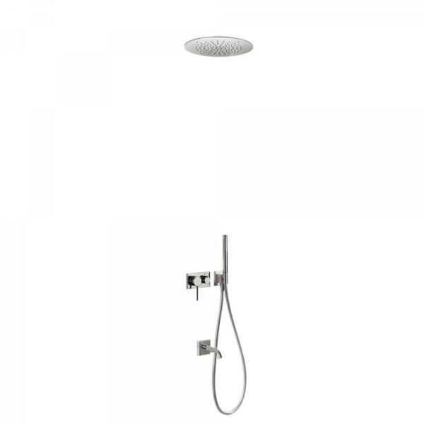 Falba építhető kivitel Tartalmazza a 3 utas belső egységet is 380 mm átmérőjű rozsdamentes acél mennyezeti fejzuhannyal Kádkifolyóval Vízkőmentesített kézi zuhannyal és fali tartóval Szatén zuhanytömlővel Acél színben