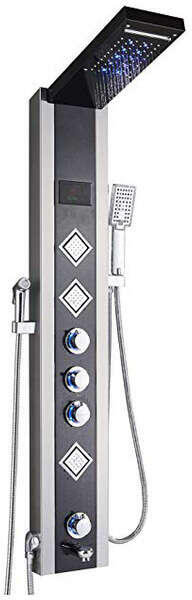 Zuhanypanel, fürdőfunkciós modell, fekete színű. _x000D_ _x000D_ Külső részén korrózióálló réteg borítja, amely biztosítja a hosszú távú használatot. _x000D_ _x000D_ A panel hőmérséklet kijelzővel, bidézuhannyal és LED-es világítással van felszerelve. _x000D_ _x000D_ Kiváló szűrés a több szűrőnek köszönhetően. _x000D_ A panel a falra van szerelve. >_x000D_