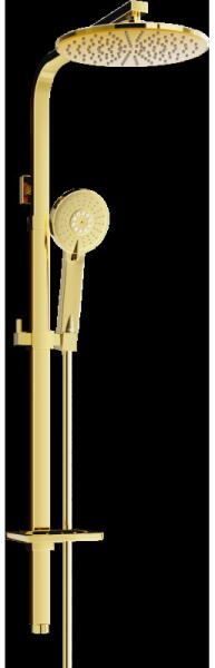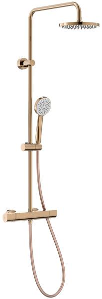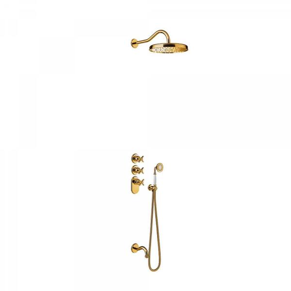 Falba építhető 3 utas kivitel Tartalmazza a termosztátos belső egységet Kádkifolyóval 310 mm-es gömbcsuklós fejzuhannyal 78 mm-es vízkőmentesített kézi zuhannyal Duplán reteszelt zuhanytömlővel Arany színben