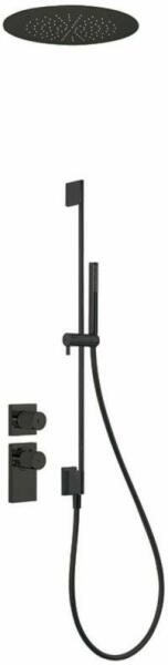 Falba építhető kivitel Tartalmazza a termosztátos belső egységet 380 mm-es rozsdamentes acél mennyezeti fejzuhannyal 760 mm-es zuhanyrúd vízbemenettel Vízkőmentesíte tt kézi zuhannyal Szatén zuhanytömlővel Matt fekete színben
