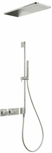 Beépíthető részt tartalmazza 2 utas váltószelep átfolyáskorlátozóval 210 x 550 mm-es rozsdamentes acél fejzuhannyal 760 mm-es zuhanyrúd vízbemenettel Vízkőmentesíte tt kézi zuhannyal Szatén zuhanytömlővel Acél színben