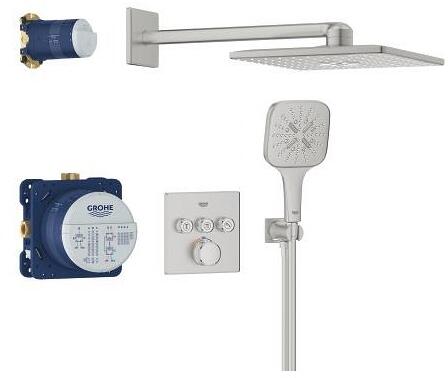 az alábbiakból áll:falsík mögötti termosztát, 3 fogyasztóra (29 126)GROHE Rapido SmartBox univerzális beépítő doboz, 1/2" (35 604)Rainshower SmartActive 310 Cube 2 funkciós fejzuhany szettel (26 479), tartalmazza a 430 mm-es vízszintes zuhanykart és a fejzuhany bépítő szettjét (26 483)Rainshower SmartActive 130 Cube 3 funkciós kézizuhanyzuhany kivezető könyök 1/2" tartóval