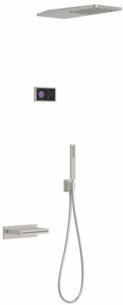 Fekete elektronikus vezérlőpanel Falba építhető elektronikus 3 utas belső egységet tartalmazza 210 x 550 mm-es rozsdamentes acél fejzuhannyal Acél cascade kádkifolyóval Vízkőmentesít ett kézi zuhannyal és fali tartóval Szatén zuhanytömlővel Acél színben