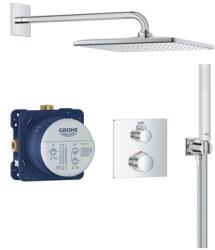 Falon kívüli kivitel 250 x 250 mm-es gömbcsuklós fejzuhannyal Vízkőmentesített 3 funkciós kézi zuhannyal Szatén zuhanytömlővel Teleszkópos zuhanyrúddal Zuhanyváltó beépített átfolyáskorlátozóval Króm kivitel