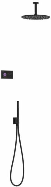 Fekete elektronikus vezérlőpanel Falba építhető elektronikus belső egységet tartalmazza 500 x 500 mm-es rozsdamentes acél mennyezeti fejzuhannyal Vízkőmentesített kézi zuhannyal és fali tartóval Szatén zuhanytömlővel Matt fekete színben
