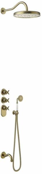 Falba építhető 3 utas kivitel Tartalmazza a termosztátos belső egységet Kádkifolyóval 310 mm-es gömbcsuklós fejzuhannyal 78 mm-es vízkőmentesített kézi zuhannyal Duplán reteszelt zuhanytömlővel Matt, kopott réz színben