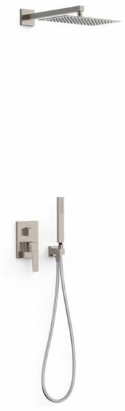 Falba építhető belső egységgel 2 utas, egykaros keverőcsaptelep Átfolyáskorl tozóval 300 x 200 mm-es fali rozsdamentes acél fejzuhany gömbcsuklóval Vízkőmentes kézi zuhannyal és fali tartóval Szatén zuhanytömlővel Rozsdamentes acél színben