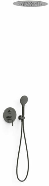 Falba építhető kivitel Tartalmazza a belső egységet Egykaros zuhanycsaptelep 380 mm-es mennyezeti fejzuhannyal 110 mm-es 3 funkciós, vízkőmentesített kézi zuhannyal és fali tartóval Szatén zuhanytömlővel Csiszolt metál fekete színben