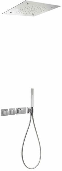 Falba építhető kivitel Tartalmazza a belső termosztátos egységet Átfolyáskorlátozóv al 500 x 500 mm-es rozsdamentes acél fejzuhany 2 fúvókával Vízkőmentesített kézi zuhannyal Szatén zuhanytömlővel Króm kivitel
