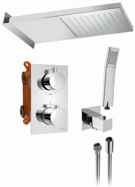 A Kimura rejtett zuhanykészlet tartalma: háromutas termosztatikus keverő, rejtett testtel fejzuhany kaszkáddal 500x200x30 mm kézi zuhany tömlővel kézizuhany tartó kifolyóval A vezérlőkarba integrált vízkapcsoló Biztosíték - biztonságos rendszer forrázás ellen Az csaptelep gyárilag be van állítva, és mindkét bemenetnél 3 bar nyomáson tesztelték. Ilyen körülmények köz