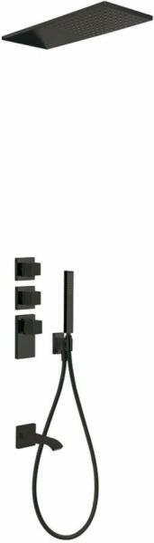 Falba építhető kivitel Tartalmazza a termosztátos belső egységet 160 x 550 mm-es rozsdamentes acél fejzuhannyal Cascade kádkifolyóval Vízkőmentesít ett kézi zuhannyal Szatén zuhanytömlővel Matt fekete színben