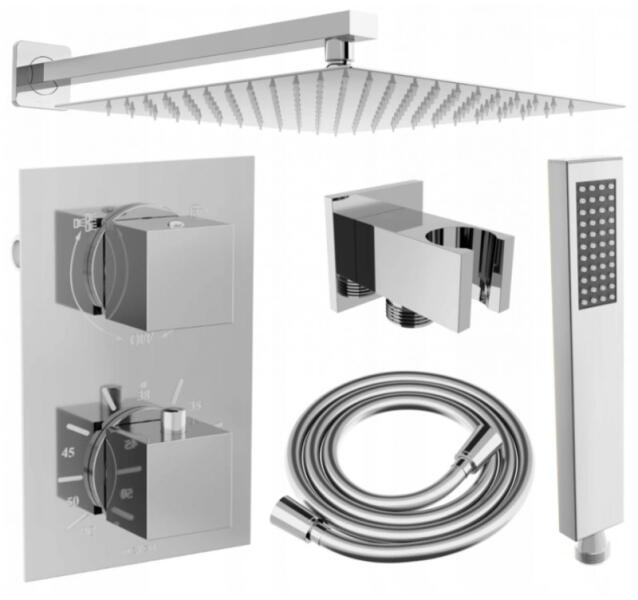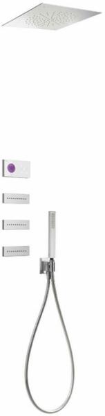 Fehér elektronikus vezérlő Falba építhető elektronikus 3 utas belső egység 380 x 380 mm-es rozsdamentes acél mennyezeti fejzuhannyal 3 vízkőmentesített fúvókával Vízkőmentesített kézi zuhannyal és fali tartóval Szatén zuhanytömlővel Króm kivitel