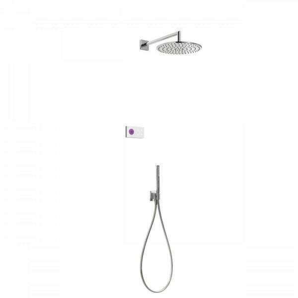 Fehér elektronikus vezérlő Falba építhető elektronikus belső egység 300 mm-es gömbcsuklós fejzuhannyal Vízkőmentesített kézi zuhannyal és fali tartóval Szatén zuhanytömlővel Króm kivitel
