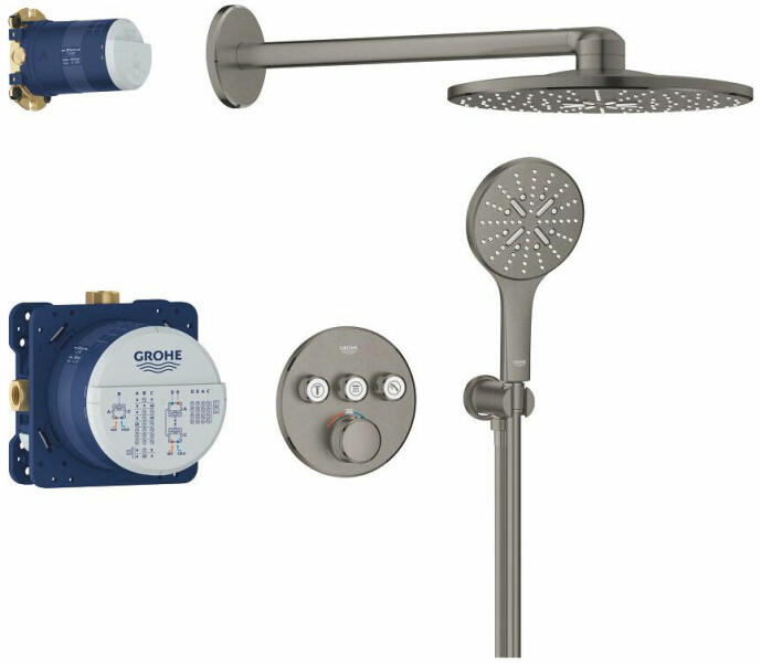 TERMÉKLEÍRÁS Szín: Brushed Hard Graphite az alábbiakból áll: falsík mögötti termosztát, 3 fogyasztóra (29 121) GROHE Rapido SmartBox univerzális beépítő doboz, 1/2" (35 604) Rainshower SmartActive 310 head shower set 2 sprays (26 475) including horizontal shower arm 430 mm and head shower rough-in (26 483) Rainshower SmartActive 130 hand shower 3 sprays shower outlet elbow 1/2" wit
