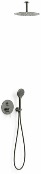 Falba építhető kivitel Tartalmazza a belső egységet Egykaros zuhanycsaptelep 300 mm-es gömbcsuklós mennyezeti fejzuhannyal 110 mm-es 3 funkciós, vízkőmentesített kézi zuhannyal és fali tartóval Szatén zuhanytömlővel Csiszolt metál fekete színben