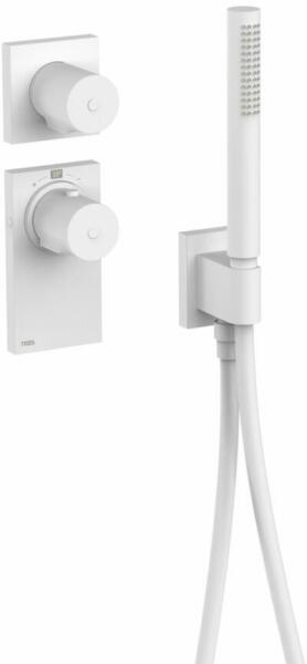 Falba építhető kivitel Tartalmazza a termosztátos belső egységet Vízkőmentesített kézi zuhannyal Szatén zuhanytömlővel Matt fehér színben