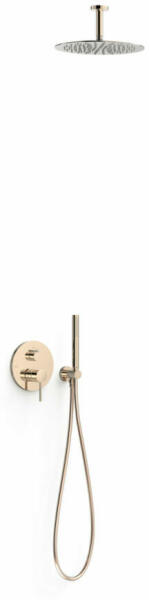 Falba építhető kivitel Tartalmazza a belső egységet Egykaros zuhanycsaptelep 300 mm-es gömbcsuklós mennyezeti fejzuhannyal Vízkőmentesített kézi zuhannyal és fali tartóval Szatén zuhanytömlővel Rózsa arany színben