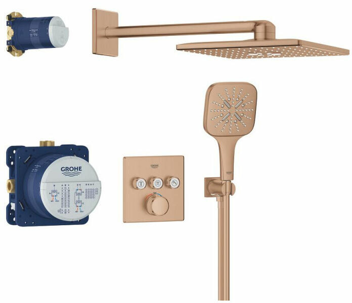 TERMÉKLEÍRÁS Szín: Brushed Warm Sunset az alábbiakból áll: falsík mögötti termosztát, 3 fogyasztóra (29 126) GROHE Rapido SmartBox univerzális beépítő doboz, 1/2" (35 604) Rainshower SmartActive 310 Cube head shower set 2 sprays (26 479) including horizontal shower arm 430 mm and head shower rough-in (26483) Rainshower SmartActive 130 Cube hand shower 3 sprays shower outlet elbow 1