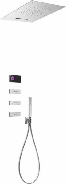 Fekete elektronikus vezérlő Falba építhető elektronikus 4 utas belső egység 500 x 650 mm-es rozsdamentes acél mennyezeti fejzuhany 2 fúvókával 3 vízkőmentesített fúvókával Vízkőmentesített kézi zuhannyal és fali tartóval Szatén zuhanytömlővel Króm kivitel