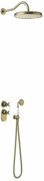 Falba építhető kivitel Tartalmazza a termosztátos belső egységet 310 mm-es gömbcsuklós fejzuhannyal 78 mm-es vízkőmentesített kézi zuhannyal és fali tartóval Duplán reteszelt zuhanytömlővel Matt, kopott réz színben