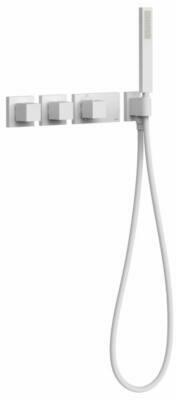 Falba építhető kivitel Tartalmazza a belső termosztátos egységet Átfolyáskorlátozóv al Vízkőmentesített kézi zuhannyal és fali tartóval Szatén zuhanytömlővel Matt fehér színben