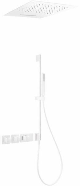 Falba építhető kivitel Tartalmazza a belső termosztátos egységet Átfolyáskorlátozóv al 500 x 500 mm-es rozsdamentes acél fejzuhany 2 fúvókával 760 mm-es zuhanyrúd vízbemenettel Vízkőmentesíte tt kézi zuhannyal Szatén zuhanytömlővel Matt fehér színben