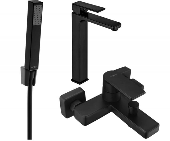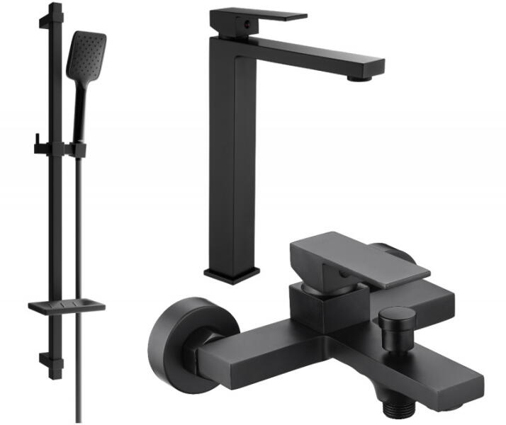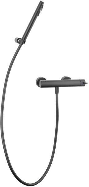 Karral fali zuhany csaptelep zuhanyszettel együtt. Fekete színben. A csaptelepek távolsága 150 mm. Matt felülettel.