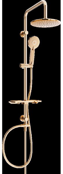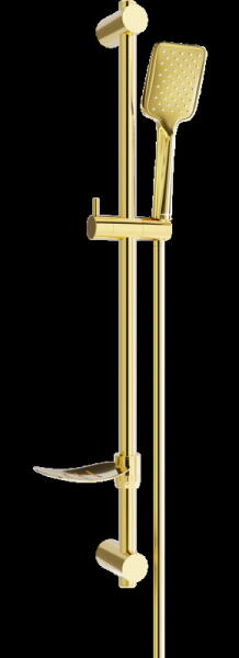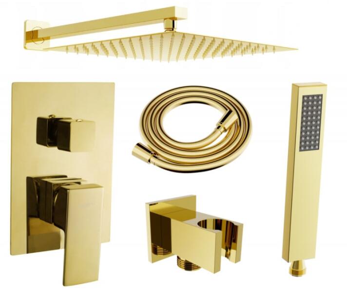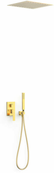 Falba építhető belső egységgel 2 utas, egykaros keverőcsaptelep Átfolyáskorl tozóval 380 x 380 mm-es mennyezeti rozsdamentes acél fejzuhany Vízkőmentes kézi zuhannyal és fali tartóval Szatén zuhanytömlővel Arany színben