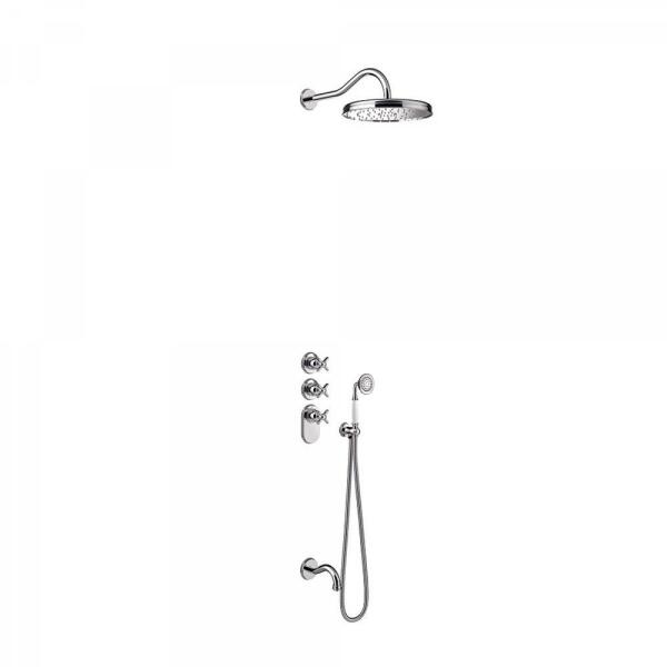 Falba építhető 3 utas kivitel Tartalmazza a termosztátos belső egységet Kádkifolyóval 310 mm-es gömbcsuklós fejzuhannyal 78 mm-es vízkőmentesített kézi zuhannyal Duplán reteszelt zuhanytömlővel Króm kivitel