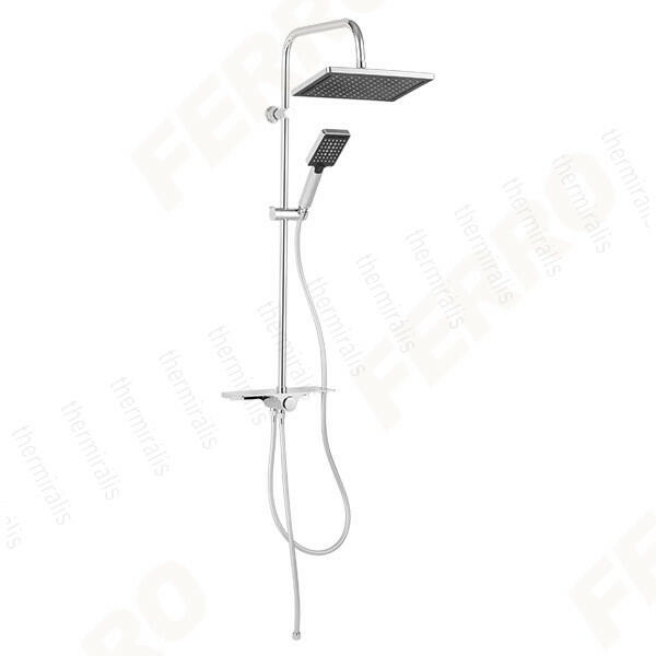 Esőztető fejzuhany: Ferro Air-in System - a vizet levegővel dúsítja vízátfolyás: ~5.9 l/perc (3 bar nyomáson) - a vízfogyasztás akár 50%-kal csökkenthető Ferro Easy Clean System - a vízkőlerakódás könnyű eltávolításához a fejzuhany fúvókáiból fém zuhanyrúd hossza: 95 cm állítható szerelési magasság szögletes fejzuhany mérete: 30x20 cm gömbcsukló a fejzuhany d