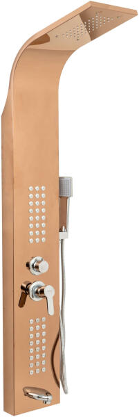 Zuhanyozó panel, hidromasszázs, 4 funkciós rozsdamentes acél, rózsa TRENDY SA trendi zuhanypanelek kiváló minőségű AISI304 rozsdamentes acélból készültek, 4 funkcióval (felső fúvókák, elülső hidromasszázs fúvókák, kézi zuhany tömlővel és fürdőkáddal). A hidromasszázs fúvókák, valamint a kaszkád fúvókák szilikonból készültek, hogy megakadályozzák a vízk