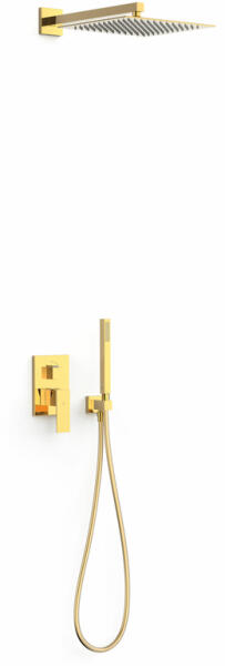 Falba építhető kivitel Tartalmazza a belső egységet Egykaros, kétutas zuhanycsaptelep 300 x 300 mm-es fali rozsdamentes acél fejzuhany gömbcsuklóval Vízkőmentesít ett kézi zuhannyal és fali tartóval Szatén zuhanytömlővel Arany színben
