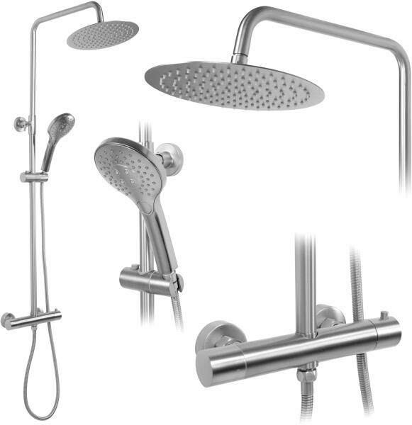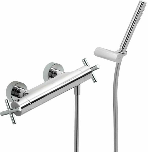 Falon kívüli kivitel Kétkaros termosztátos zuhanycsaptelep Vízkőmentesít ett kézi zuhannyal és fali tartóval Szatén zuhanytömlővel Króm kivitel