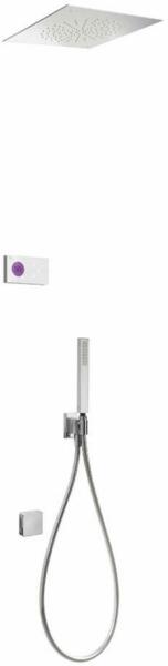 Fehér elektronikus vezérlőpanel Falba építhető elektronikus 3 utas belső egységet tartalmazza 380 x 380 mm-es rozsdamentes acél mennyezeti fejzuhannyal Acél cascade kádbeömlővel Vízkőmentesít ett kézi zuhannyal és fali tartóval Szatén zuhanytömlővel Króm kivitel