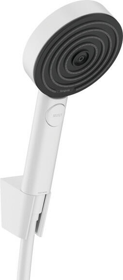 Hansgrohe Pulsify Select S, szett zuhanytartóval 105 3jet Relaxáció zuhanycsővel 1250 mm, matt fehér, HAN-24302700 Termékleírás és paraméterek A készlet tartalma: kézi zuhany zuhanytartó zuhany tömlő Zuhanyfej mérete: Ø 105 mm Áramlat típusa: PowderRain, IntenseRain, masszázspatak Kényelmes váltás a Select gombbal Maximális áramlás 3 bar-nál: 11,4 l/perc Min. áramlási